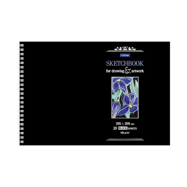 Скетчбук черные листы А4 20л, 160г/м2, гребень "Ирисы" 20А4Aгр_23480 Hatber