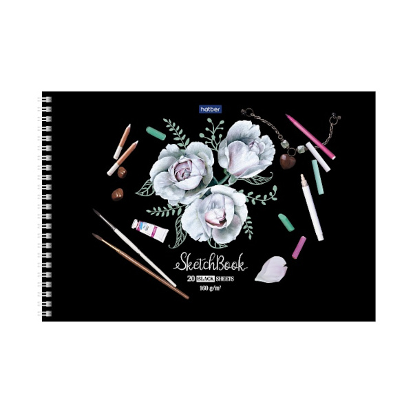 Скетчбук черные листы А4 20л, 160г/м2, гребень "Нежные цветы" 20А4Aгр_23425 Hatber