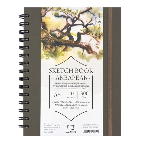 Скетчбук для акварели А5 20л, 300г/м2, гребень "WaterFall" серый, резинка 401638 Малевичъ