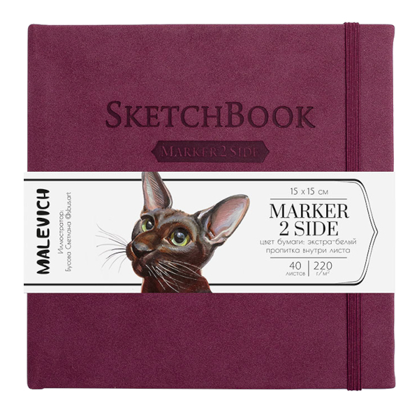 Скетчбук для маркеров 150*150мм 40л, 220г/м2, сшивка, бордовый, резинка 401144 Малевичъ