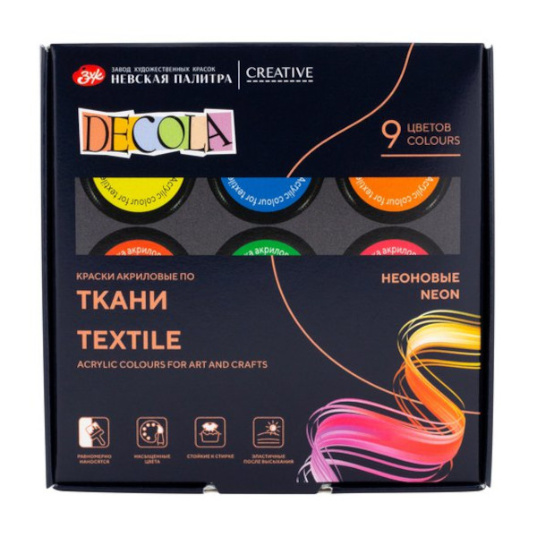 Краски акриловые по ткани Невская Палитра "Decola" 9цв, 20мл в банке, неоновый, карт.уп. 41412017