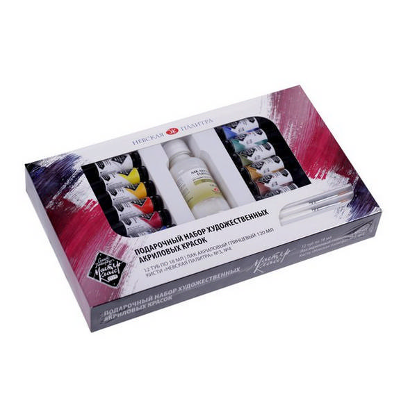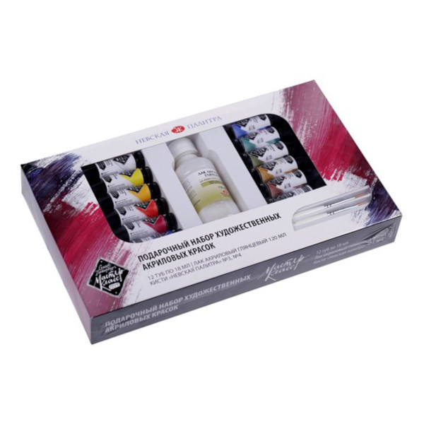 Краски акриловые Невская палитра "Мастер класс" 12цв, 18мл в тубе, лак, кисти в подар.уп. 12341966