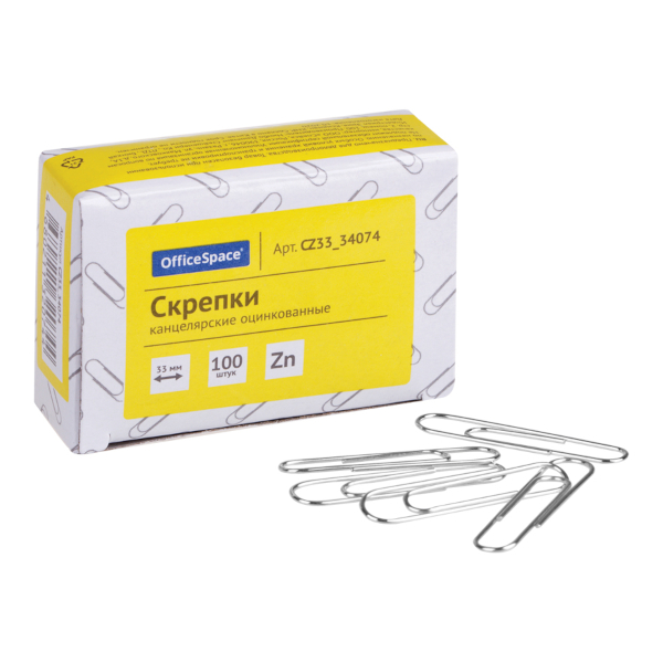 Скрепки 33мм OfficeSpace овальные, оцинкованные., в карт.уп. CZ33_34074 (100шт)