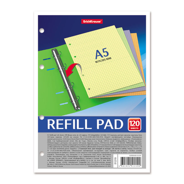 Сменный блок для тетрадей на кольцах А5 120л, клетка, цветной (4цв*30л) 51219 Erich Krause