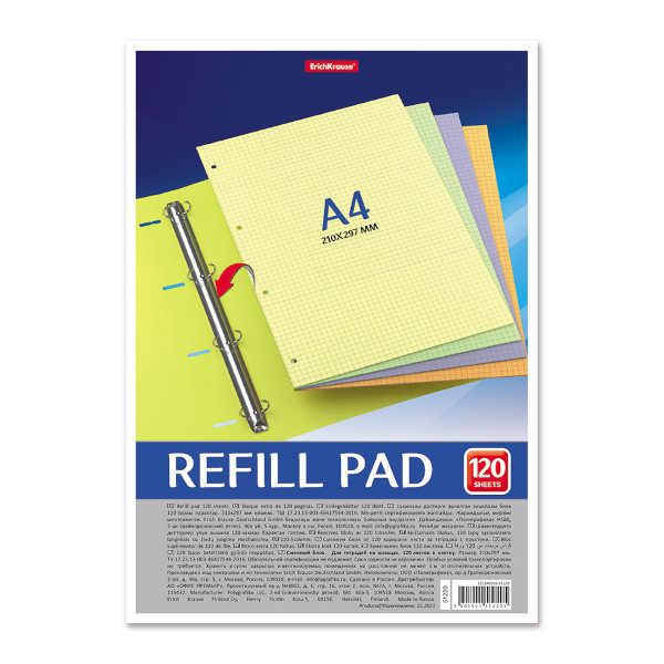 Сменный блок для тетрадей на кольцах А4 120л, клетка, цветной (4цв*30л) 51220 Erich Krause