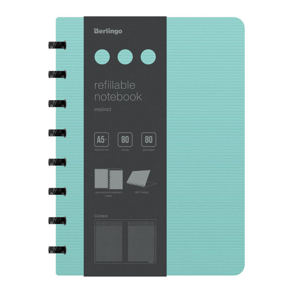 Тетрадь 80л А5+ клетка на кольцах "Instinct" пластик, мятный, линейка-закладка RNt_A5102 Berlingo.