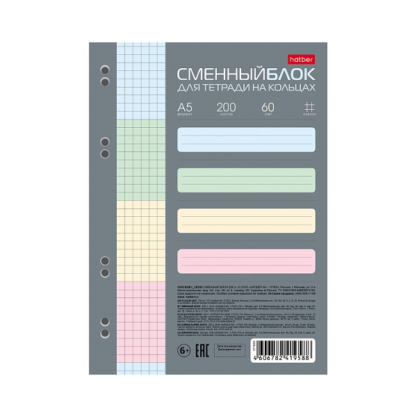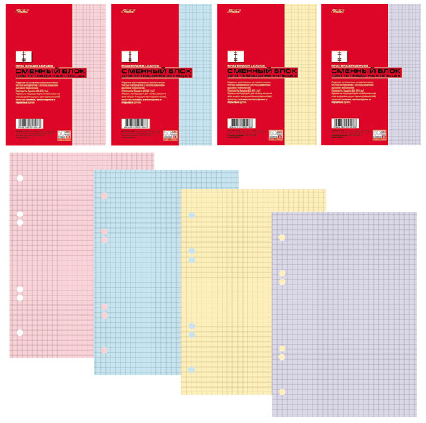 Сменный блок для тетрадей на кольцах А5 200л, клетка, цветной (4цв) 200СБ5В1_26292 Hatber