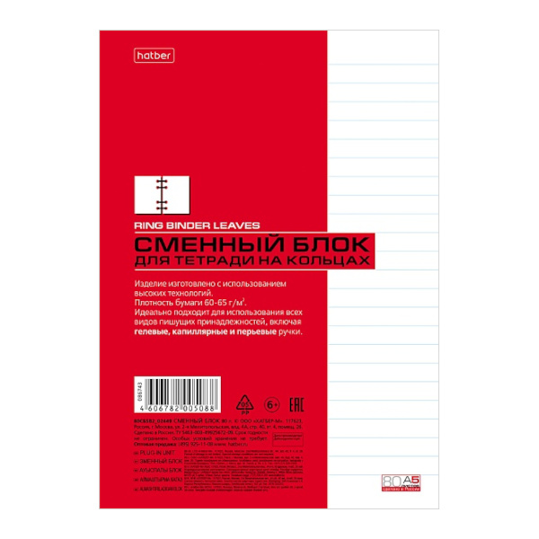 Сменный блок для тетрадей на кольцах А5 80л, линейка, белый 80СБ5В2_02449 Hatber