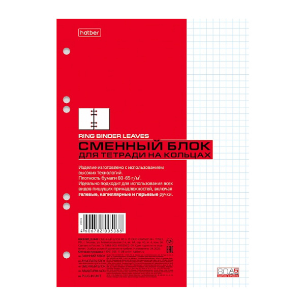 Сменный блок для тетрадей на кольцах А5 80л, клетка, белый 80СБ5B1_02449 Hatber