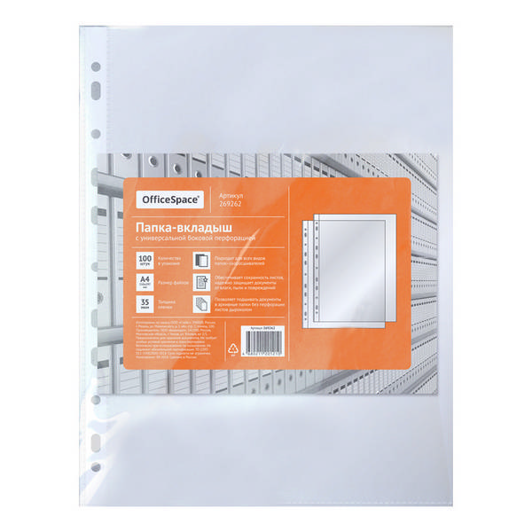 Файл (мультифора) А4 35мкм, прозрачный, глянцевый 269262 (уп 100шт) OfficeSpace упаковка