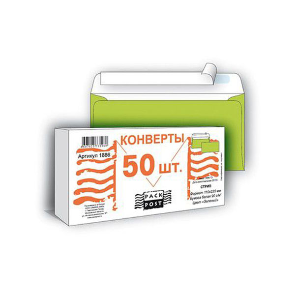 Конверт Е65 110*220мм без окна, без запечатки, стрип, 90г/м2, зеленый 1886 Packpost
