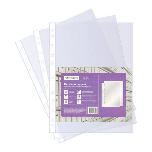 Файл (мультифора) А4 40мкм, прозрачный, глянцевый ПВ_40ГЛ (уп 100шт) OfficeSpace упаковка