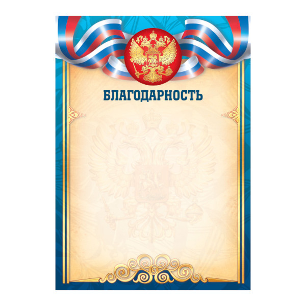 Бланк "Благодарность" с Российской символикой, стандарт, бумага 157г/м2 9325 Квадра