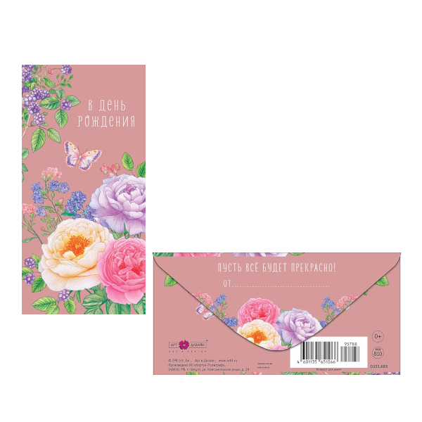 Открытка-конверт для денег "В День Рождения. Бабочка, пионы" 8,3*16,7см 0321.685 Арт Дизайн