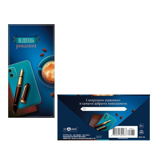 Открытка-конверт для денег "В День Рождения. Ручка, телефон, кофе" 8,3*16,7см 0321.774 Арт Дизайн