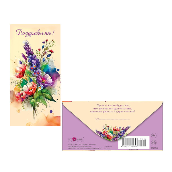 Открытка-конверт для денег "Поздравляю! Букет" 8,3*16,7см 0317.311 Арт Дизайн