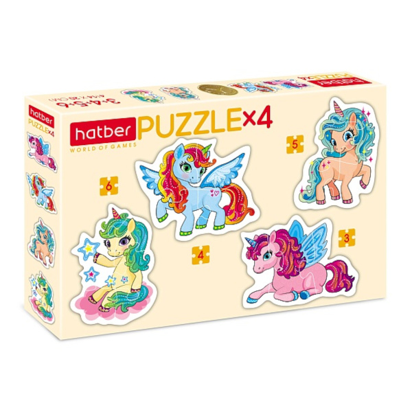 Пазлы-фигурные 3, 4, 5, 6 элем. дет. "4 в 1. Единорожки" А5 200*140мм ПЗ5_28752 Hatber