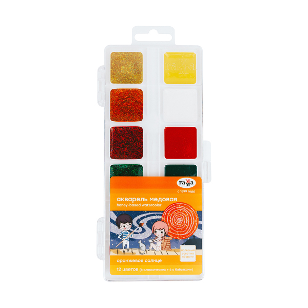 Акварель мед. Гамма "Оранжевое солнце" 12цв (6с блёстками и 6классик) без кист. в пласт.уп. 291020207