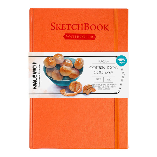 Скетчбук для акварели А5 30л, 200г/м2, сшивка, оранжевый, резинка 401523 Малевичъ