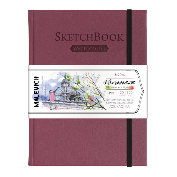 Скетчбук для акварели А5 20л, 300г/м2, сшивка "Veroneze" винный, резинка 401539 Малевичъ