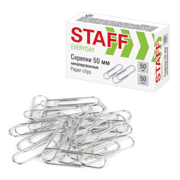 Скрепки 50мм Staff "Everyday" овальные, никелированные, в карт.уп. (50шт) 226759