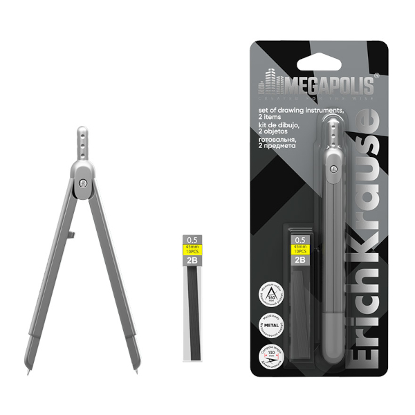Циркуль Erich Krause "Megapolis" 130мм, металл, блистер, серебро +10 грифелей 64793