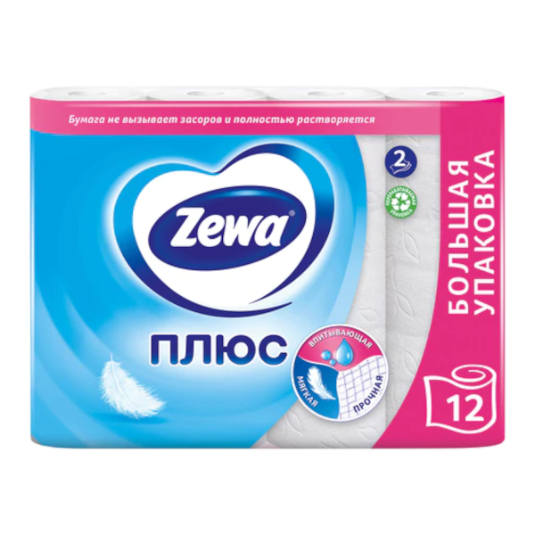 Бумага туалетная 2-слойная ZEWA "Плюс" 9,5см*23м, втулка, белая (1уп*12рул.) 144090