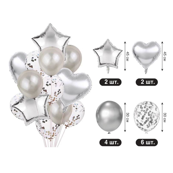 Набор шаров "Серебро" 14шт (4фольга+10латекс+5м веревка) 0994.896 Арт Дизайн