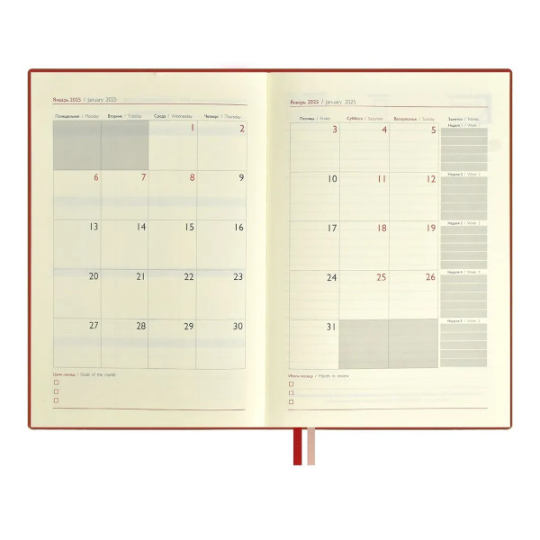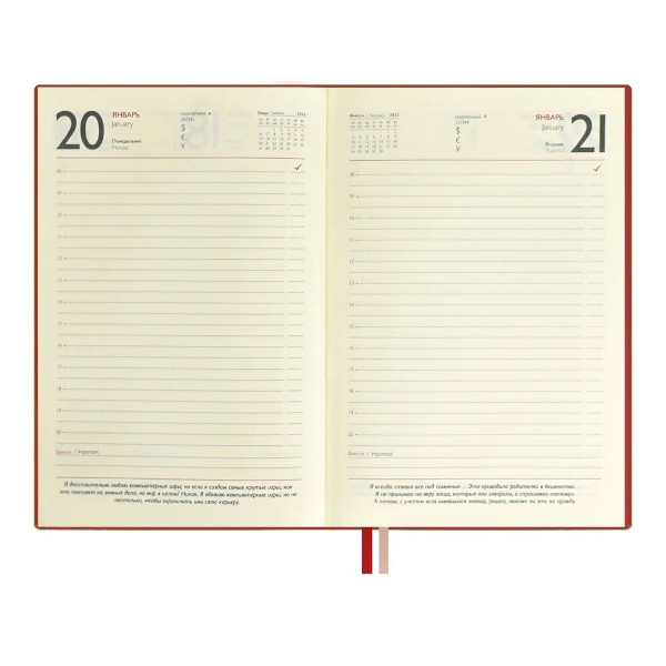 Доп. описание: Ежедневник с гибкой обложкой из искусственной кожи, в классическом красном цвете, станет верным спутником на весь 2025 год. Особенность данного ежедневника заключается в мотивационных цитатах одного из дальновидных умов современности - Илона Маска. Удобное помесячное и ежедневное планирование по часам поможет учесть все детали. Календарь не только на 2025г, но и на 2026г - дает возможность строить планы на следующий год. С помощью двух закладок Вы быстро найдете важную информацию или откроете нужную страницу. Окрашенный в цвет обложки срез делает ежедневник особенно стильным. Гибкая обложка поможет удобно разместить его в сумке. Ежедневник ESCALADA с цитатами Илона Маска поможет воплотить в жизнь ваши самые амбициозные цели!