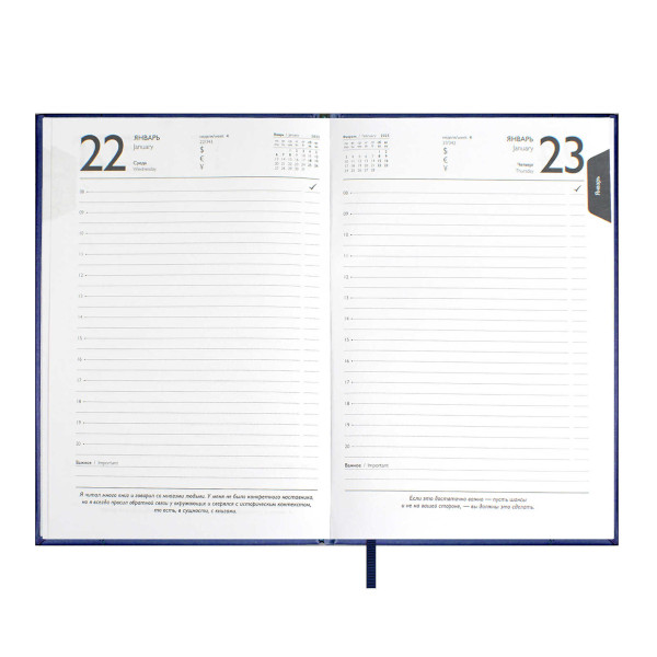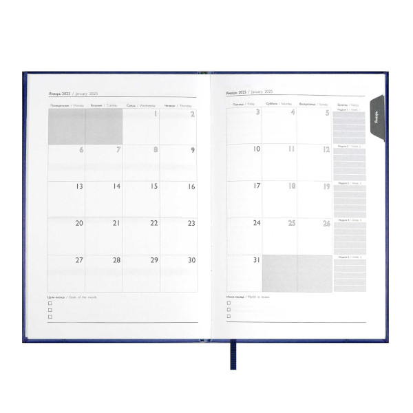 Доп. описание: Ежедневник с твердой обложкой из искусственной кожи, в классическом синем цвете, станет верным спутником на весь 2025 год. Особенность данного ежедневника заключается в мотивационных цитатах одного из дальновидных умов современности - Илона Маска. Удобное помесячное и ежедневное планирование по часам поможет учесть все детали. Календарь не только на 2025г, но и на 2026г - дает возможность строить планы на следующий год. С помощью ляссе в цвет обложки Вы быстро найдете важную информацию или откроете нужную страницу. Твердая обложка с поролоном, декоративной строчкой в цвет и тиснением сохранит листы от замятия. Ежедневник ESCALADA с цитатами Илона Маска поможет воплотить в жизнь ваши самые амбициозные цели!