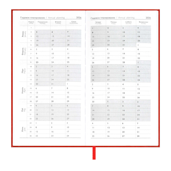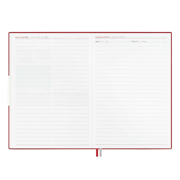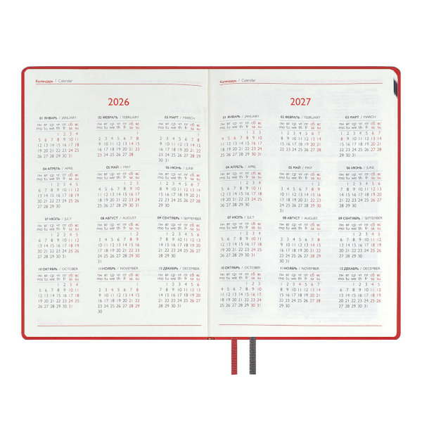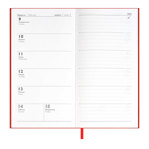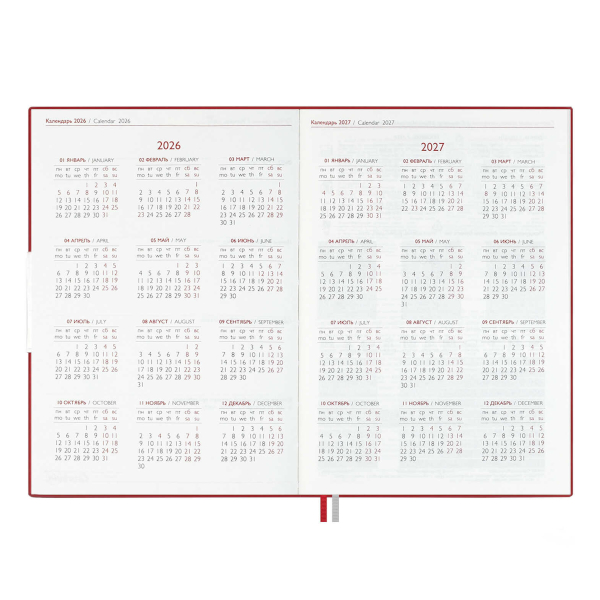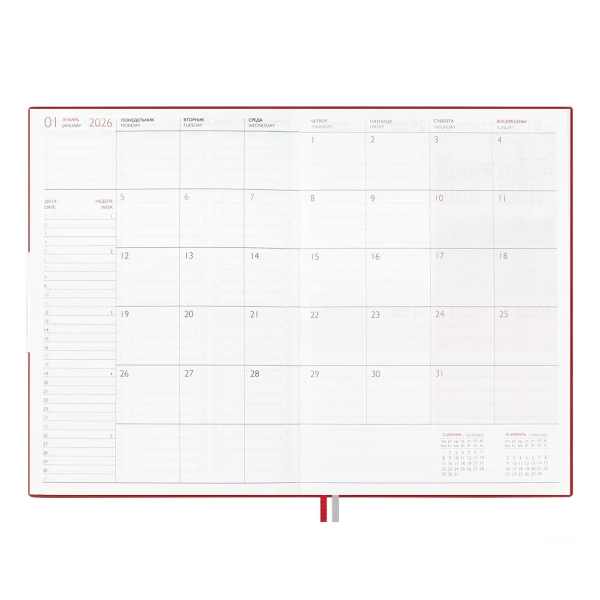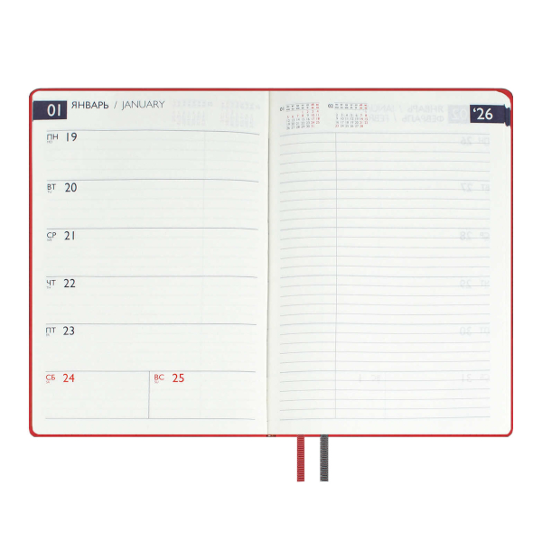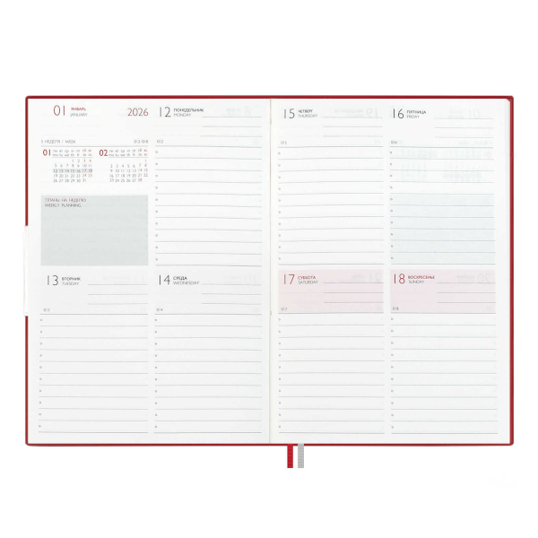 Доп. описание: Еженедельник датированный А6 (87*166мм) с твердой обложкой из искусственной кожи «наппа» в классическом красном цвете, станет верным спутником на весь 2026 год. Оформление обложки дополнено стильным блинтовом тиснением и аккуратной отделкой строчкой. Сшитый блок состоит из 64л и выполнен из белого офсета плотностью 70г/м2. Такой удобный и стильный еженедельник станет незаменимым помощником для занятых людей, стремящихся эффективно организовать своё время и достигать высоких результатов во всех сферах жизни.