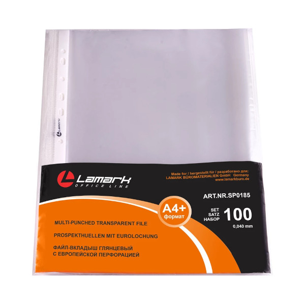 Файл (мультифора) А4+ 40мкм, прозрачный, глянцевый SP0185 (уп 100шт) Lamark упаковка