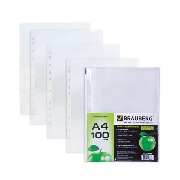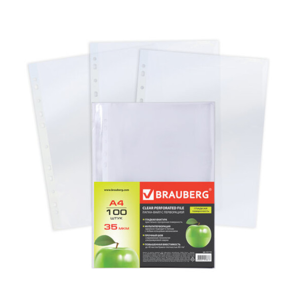 Файл (мультифора) А4 35мкм, прозрачный, глянцевый "Яблоко" 221710 (уп 100шт) Brauberg упаковка