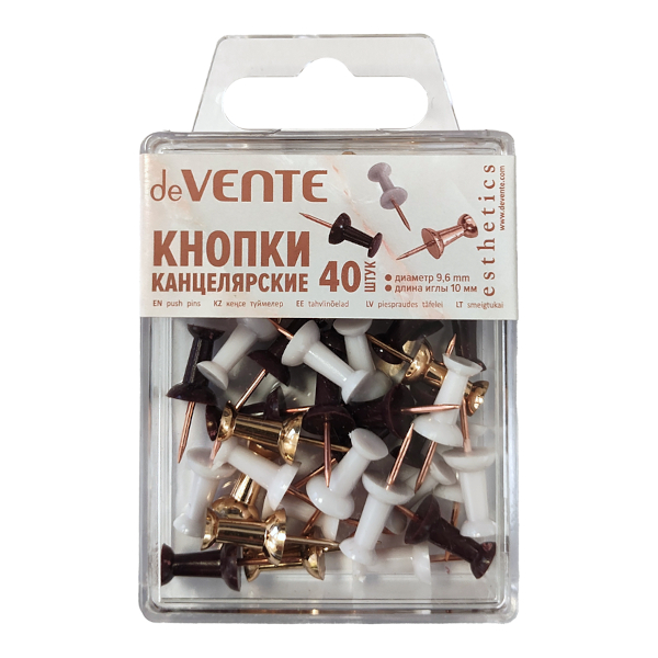 Доп. описание: Кнопки канцелярские силовые "deVENTE. Esthetics" диаметр 9,6 мм, с иглой цвета розовое золото, в форме гвоздика, 40 шт в пластиковой коробке, ассорти 3 цвета (бургунди, лавандово-пепельный и розовое золото)
