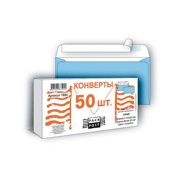 Конверт Е65 110*220мм без окна, без запечатки, стрип, 90г/м2, голубой 1884 Packpost