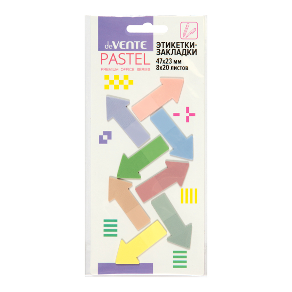 Доп. описание: Набор самоклеящихся этикеток-закладок "deVENTE. Pastel" пластиковые полупрозрачные в форме стрелки 47x23 мм, 8x20 листов, 8 пастельных цветов, в картонном блистере и пластиковом пакете с европодвесом