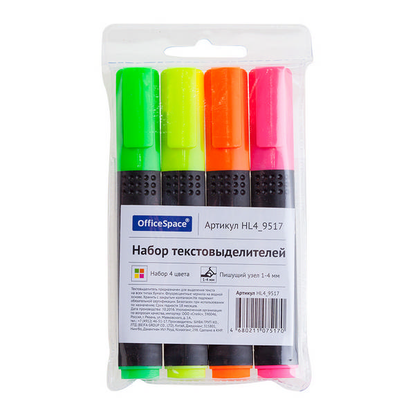Набор текстовыделителей 4цв OfficeSpace /жел.,оранж.,роз.,зел./скошенный/1-4мм HL4_9517