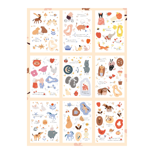 Доп. описание: Набор состоит из 9 листов наклеек, каждый лист состоит из различных наклеек, которые имеют разный размер и форму. Их легко использовать, они уже вырезаны и готовы к нанесению на любую гладкую и ровную поверхность. Количество наклеек в наборе: 96. Можно использовать в скрапбукинге, для составления различных композиций, а так же выделить важные элементы в ваших конспектах. Наклейка: матовая самоклеющаяся пленка, печать 4+0.