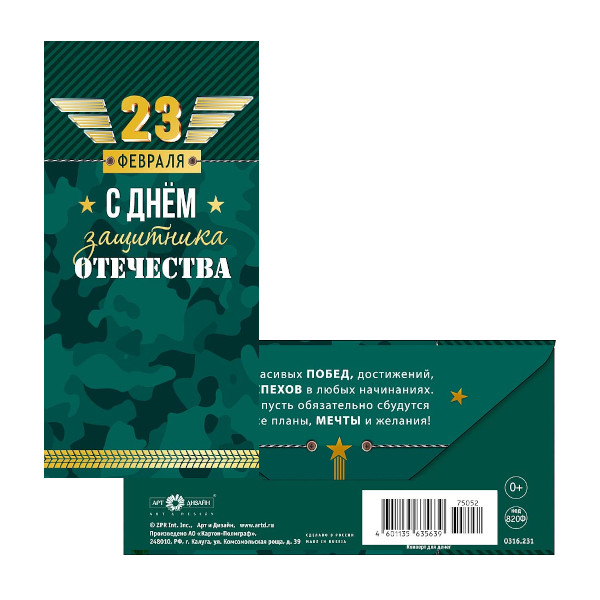 Открытка-конверт "23 февраля С Днем Защитника Отечества" 8,3*16,7см 0316.231 Арт Дизайн