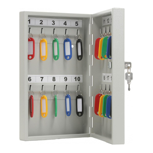 Доп. описание: Шкаф для ключей, предназначен для упорядоченного размещения и защиты от несанкционированного использования ключей. Размещается стационарно на стене, в корпусе предусмотрены отверстия для крепления. Изготовлен из стали толщиной 0.9 мм. Оснащен металлическими крючками для навешивания ключей. Ключевой замок. Количество крючков для ключей - 20 штук. В комплект ключниц входят пластиковые цветные брелоки, рассчитанные на количество ключей и самоклеящиеся номерки. Фурнитура для крепления к стене в комплект не входит.