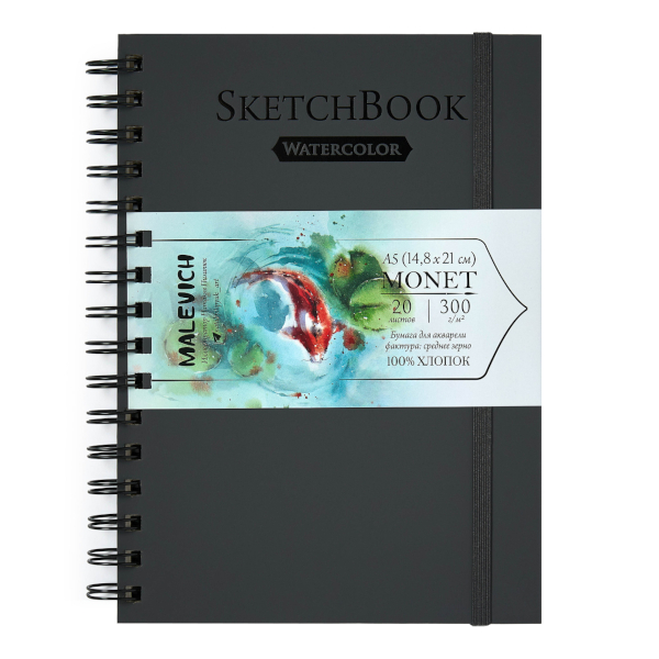 Скетчбук для акварели А5 20л, 300г/м2, гребень "Monet" графитный, резинка 401624 Малевичъ