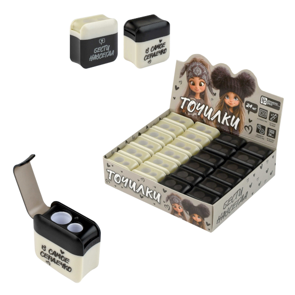 Доп. описание: Точилка, арт.72684/ 24 ДЕВЧОНКИ НА СТИЛЕ (шоу-бокс, 24 шт., ассорти, полистирол, чёрный, серый, 2 отверстие (-я) диаметром: 8 мм, 11 мм, 3,6x3,6x2 см, контейнер для стружки: есть).
